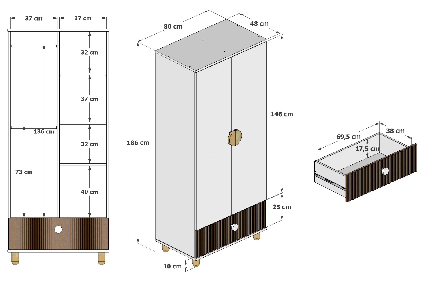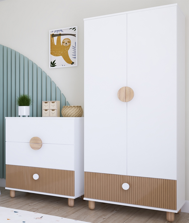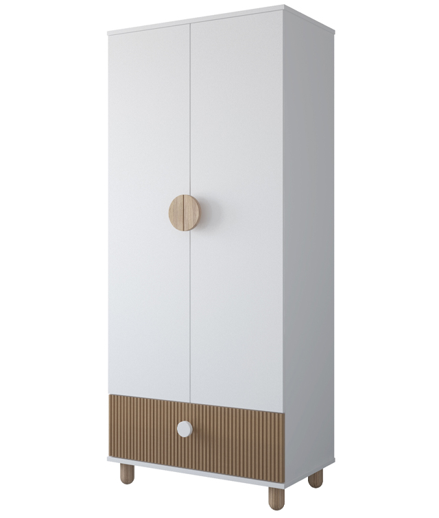 Ντουλάπα ιδανική για το βρεφικό και παιδικό δωμάτιο. Το κυρίως μέρος χωρίζεται σε δύο μέρη. Το ένα μέρος διαθέσει δύο ξύλιες μπάρες για κρεμαστά ρούχα και το άλλο έχει τρία ράφια (το ύψος των δύο είνια ρυθμιζόμενο). Στο κάτω μέρος της ντουλάπας υπάρχει μεγάλο συρτάρι στηριζόμενο με οδηγούς.