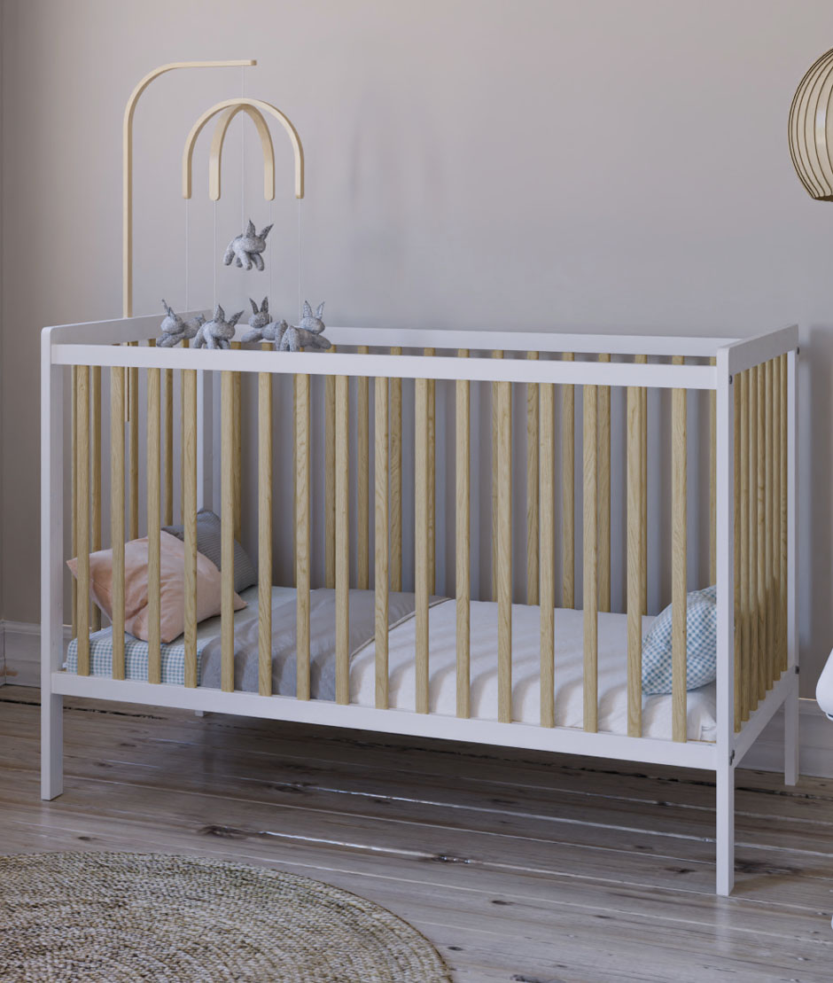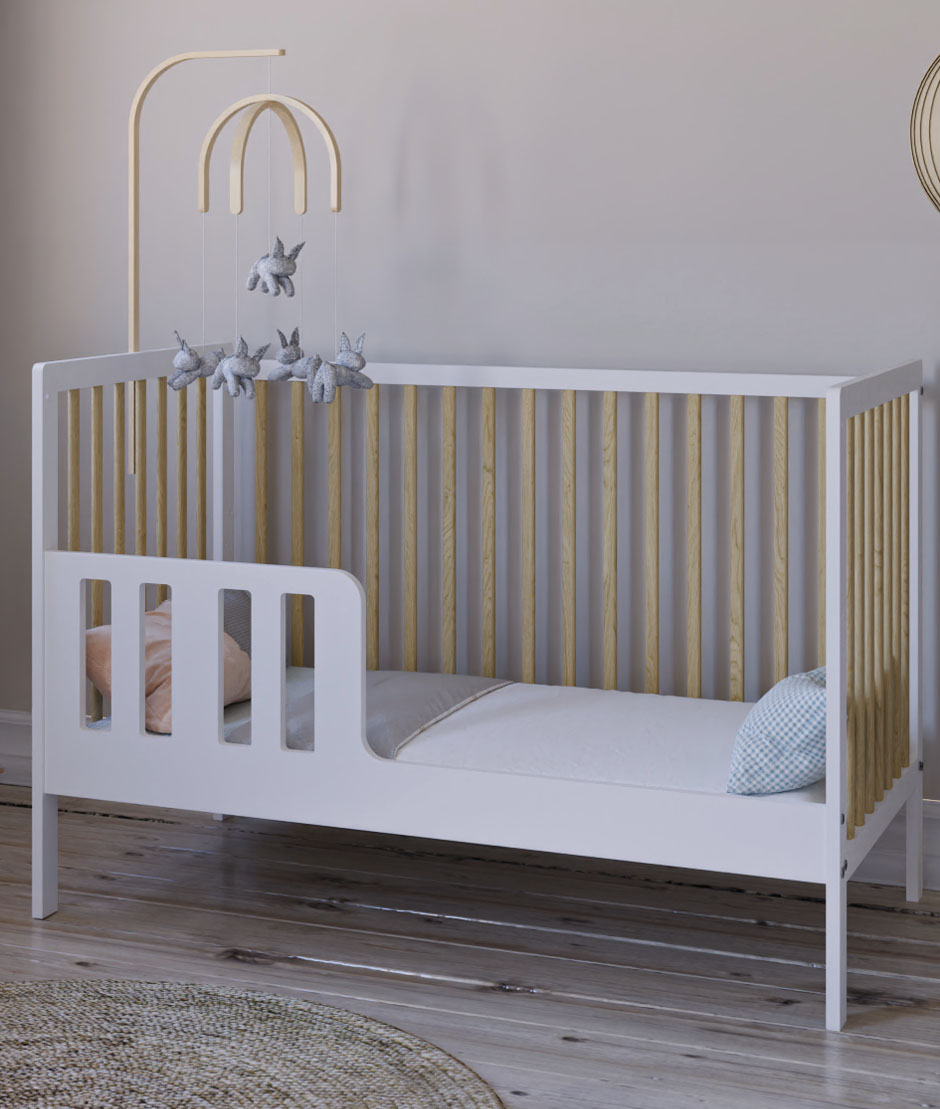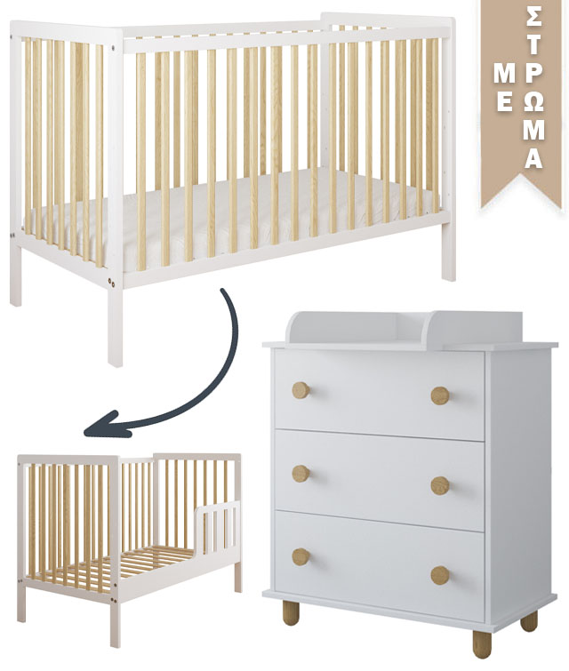 Σετ επίπλων για το δωμάτιο του μωρού – ξύλινη βρεφική κούνια που μπορεί να μετατραπεί εύκολα σε παιδικό κρεβάτι, προσφέροντας άνεση και λειτουργικότητα για πολλά χρόνια. Συμπληρώνεται με μια πρακτική, μεγάλη συρταριέρα που διαθέτει αποσπώμενο αποστατήρα για αλλαγή πάνας. Ο αρμονικός συνδυασμός λευκού και φυσικού ξύλου χαρίζει στο βρεφικό δωμάτιο αίσθηση θαλπωρής, φωτεινότητας και κομψότητας. Το σετ περιλαμβάνει: