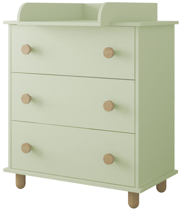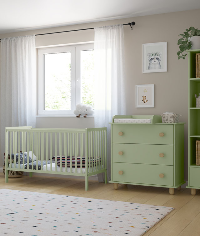 Σετ επίπλων για βρεφικό δωμάτιο – ξύλινη κούνια που μετατρέπεται εύκολα σε άνετο παιδικό κρεβάτι και μια ευρύχωρη συρταριέρα με αποσπώμενη αλλαξιέρα, ιδανική για πρακτική οργάνωση. Η απαλή απόχρωση της μέντας δημιουργεί μια αίσθηση ηρεμίας και ισορροπίας, ενώ παράλληλα γεμίζει το δωμάτιο με ζωντάνια και χαρούμενη ατμόσφαιρα, κάνοντάς το έναν χώρο φιλόξενο και κομψό για το μωρό σας. Το σετ περιλαμβάνει: