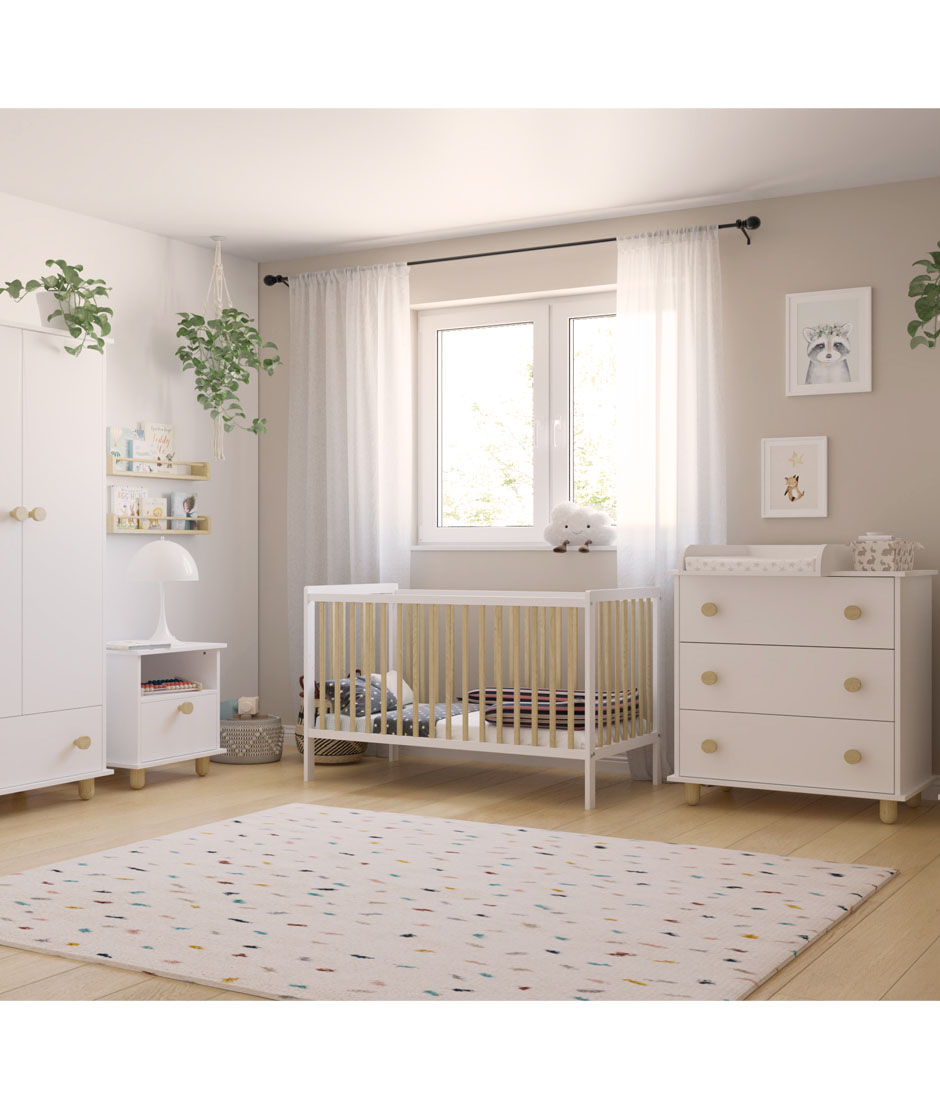 Βρεφική κούνια Lumi με πλακέ καγκελάκια. Tα δύο χρώματα – φυσικό ξύλο και λευκό- προσθέτουν μοντέρνα στοιχεία στο κλασικό σχέδιο. Η κούνια Lumi μπορεί να μεταμορφωθεί σε κρεβατάκι όταν τοποθετηθεί η μπάρα ασφαλείας (πωλείται χωριστά). Kατασκευάζεται στην Πολωνία από ξύλο πεύκου.