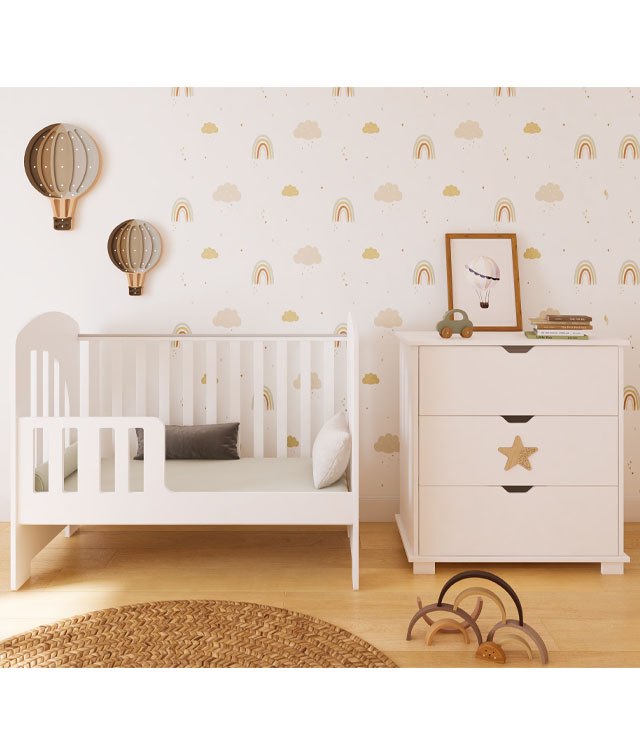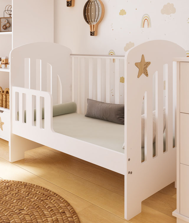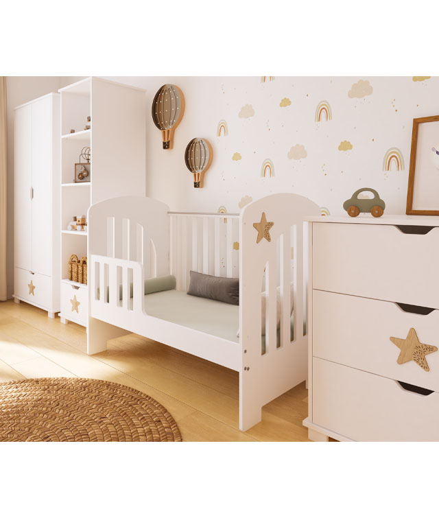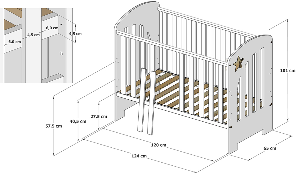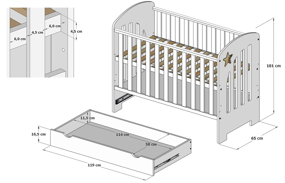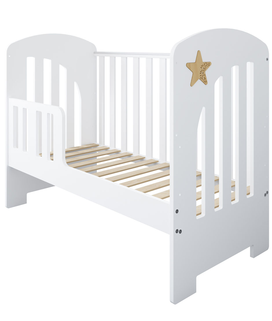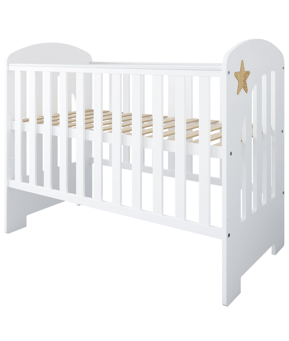 Βρεφική κούνια με φαρδιά καγκελάκια διακοσμημένη με ένα υπέροχο αστέρι σε χρώμα της επιλογής σας: φυσικό ξύλο ή λευκό. Kατασκευάζεται στην Πολωνία από κόντρα πλακέ και ξύλο πεύκου.