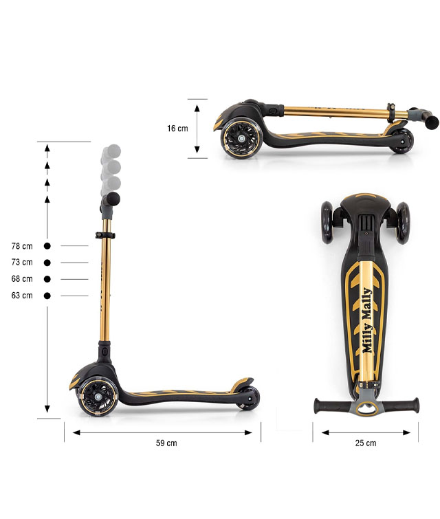Το πατίνι διαθέτει ρυθμιζόμενο τιμόνι 4 επιπέδων, ώστε να προσαρμόζεται στο ύψος του παιδιού και να το συνοδεύει καθώς μεγαλώνει. Επιπλέον, το τιμόνι διπλώνει εύκολα χωρίς εργαλεία με ένα κουμπί, κάνοντας το πατίνι πολύ πρακτικό για μεταφορά και αποθήκευση.