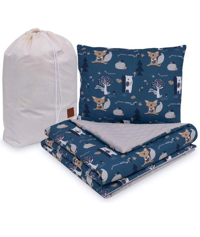Καλέστε μας καθημερινά από τις 10.00 έως τις 15.00 στο 210 55 62 491 .Το σετ αποτελείται από πάπλωμα και μαξιλάρι διπλής όψης. Από τη μία πλευρά είναι ραμμένα από 100% βαμβάκι άριστης ποιότητας, φυσικό, διαπνέον και φιλικό προς το ευαίσθητο βρεφικό δέρμα και από την άλλη πλευρά διαθέτουν μαλακή, ζεστή καπιτονέ ύφανση τύπου Velvet, η οποία προσφέρει επιπλέον θαλπωρή και μια ευχάριστη, βελούδινη αίσθηση στην αφή. Χάρη στη διπλή όψη, μπορείτε εύκολα να προσαρμόζετε το σετ ανάλογα με την εποχή και τις ανάγκες του παιδιού. Η γέμιση τόσο του παπλώματος όσο και του μαξιλαριού αποτελείται από υποαλλεργική σιλικονούχα ίνα, που διατηρεί τον όγκο και την ελαστικότητά της, προσφέροντας σωστή κυκλοφορία του αέρα και άνετο ύπνο. Όλα τα υφάσματα που χρησιμοποιούνται διαθέτουν πιστοποίηση OEKO-TEX Standard 100, που εγγυάται ότι είναι απαλλαγμένα από επιβλαβείς ουσίες και ασφαλή για τα παιδιά.